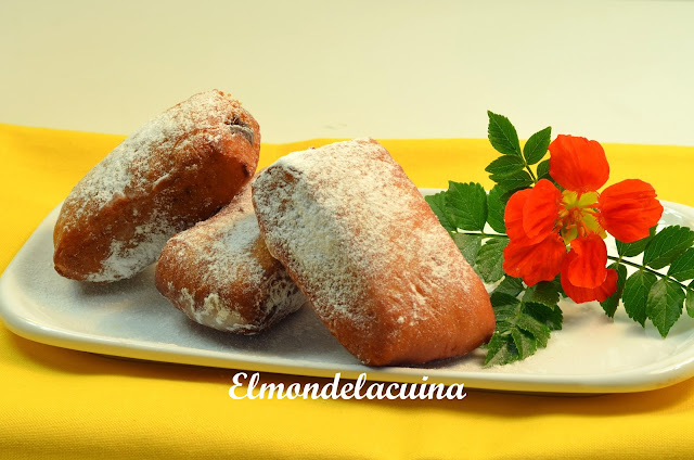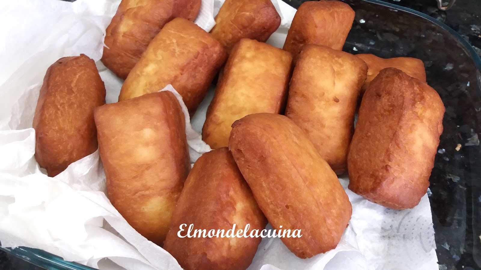 - Escalfem oli en un cassó. Quan estigui a 170º ja podem anar fregint els bunyols, màxim 2 minuts per banda. No fregim més de 3 cada vegada, per evitar que baixi la temperatura de l'oli. Quan estiguin daurats, els posem a sobre de paper de cuina per eliminar l'excés d'oli. I els empolsinem amb sucre mòlt.